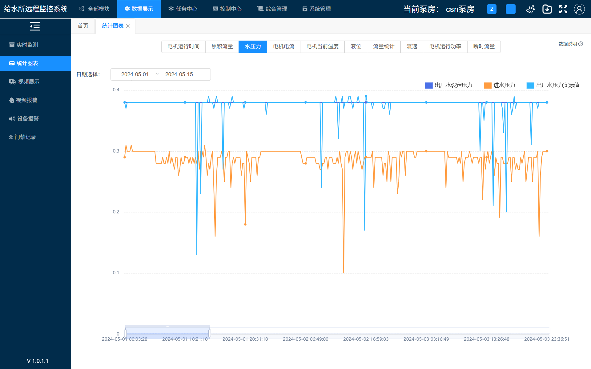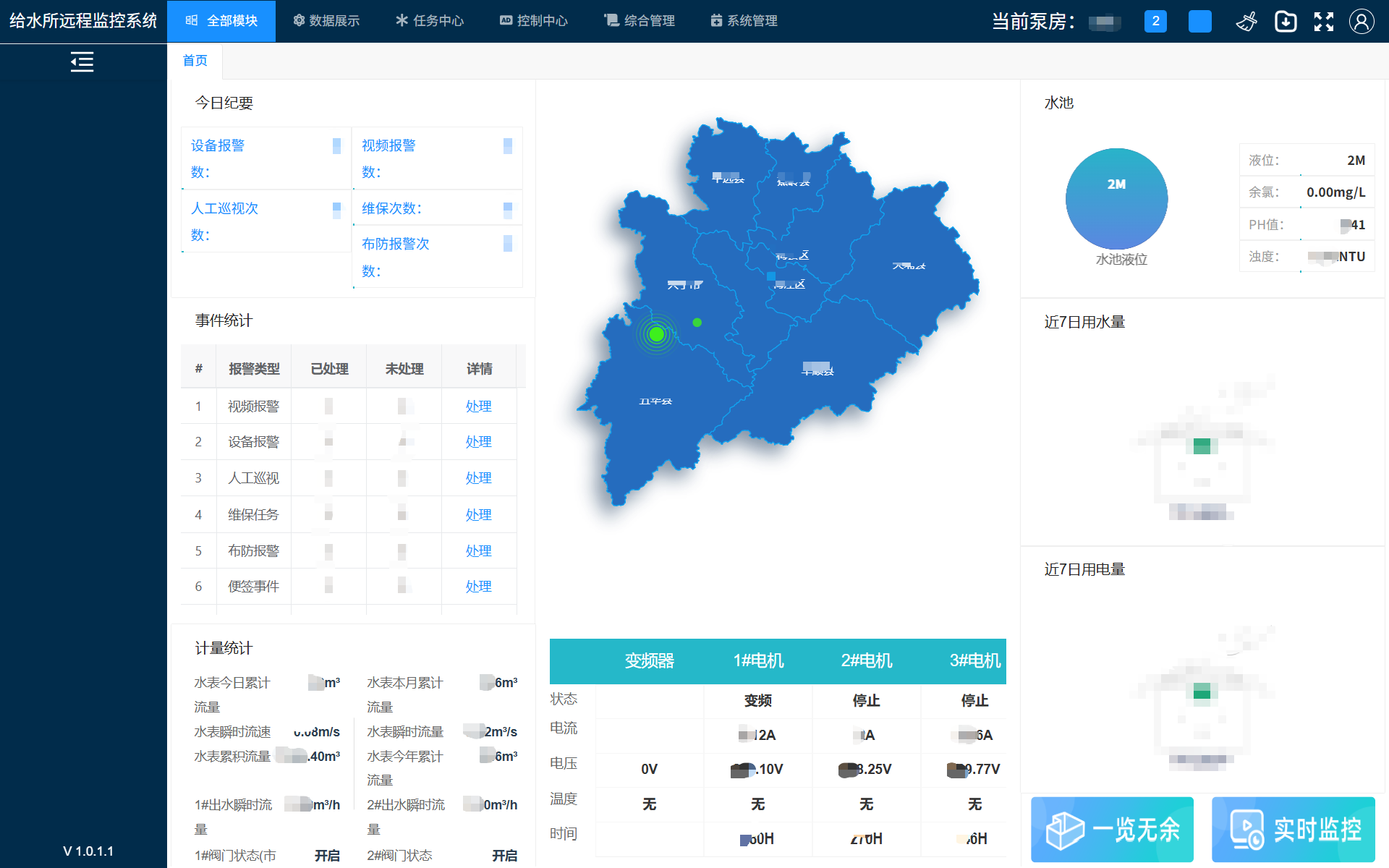 3、远程监控:系统提供远程监测和控制功能,管理人员可通过前端Web界面实时查看泵站运行状况,进行远程控制操作。系统集成了摄像头监控功能,方便管理人员远程巡视泵房情况。